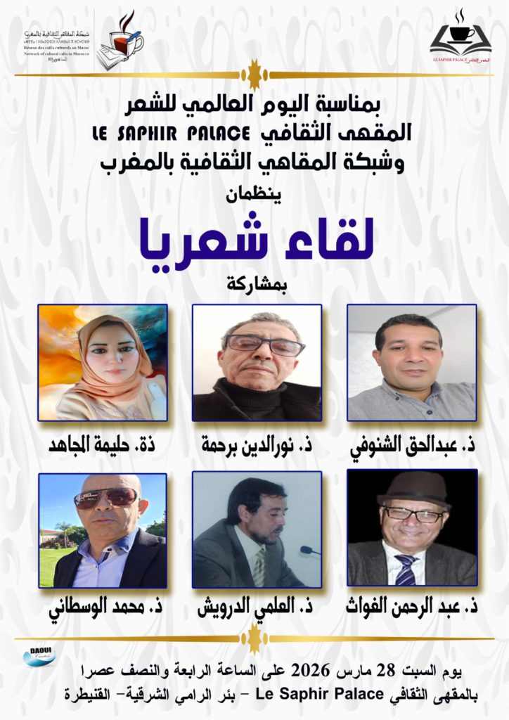 الفجر الجديد: بمناسبة اليوم العالمي للشعر ، تنظم شبكة المقاهي الثقافية بالمغرب ـ تأسست في يونيو 2015 ـ ، إحتفالية شعرية يوم السبت 28...