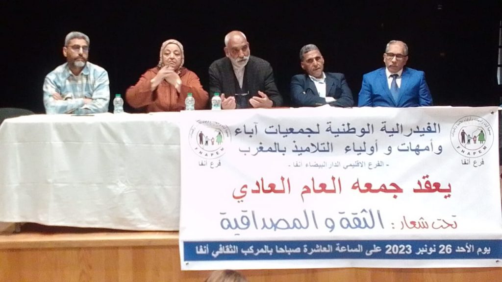 انعقد يوم الأحد 26 نونبر 2023، الجمع العام العادي للفرع الإقليمي الدار البيضاء أنفا التابع الفيدرالية الوطنية لجمعيات اباء وأمهات وأولياء التلاميذ بالمغرب بالمركب الثقافي أنفا على الساعة العاشرة صباحا، بحضور كل الجمعيات المنضوية تحت لوائه بتراب عمالة مقاطعات الدار البيضاء أنفا، والمنتدبين من طرف رؤساء جمعيات الآباء بالمؤسسات التعليمية الابتدائي الإعدادي الثانوي. افتتح الجمع العام السيد الحاج ابراهيم غماس نائب رئيس الفرع الدي تعذر عليه الحضور لأسباب مهنية، بكلمة ترحيبية للحاضرين من خلالها ذكر بجدول اعمال الجمع ليتيح لافتتاح الجمع بآيات من الذكر الحكيم بعد ذلك كانت كلمة للسيد الحاج محمد مشكور ممثل المكتب الوطني للفيدرالية الوطنية لجمعيات اباء وأمهات وأولياء التلاميذ بالمغرب من خلالها أعطى نبدة عن الفيدرالية والخدمات التي تقدمها لمصلحة المتعلمين والمتعلمات بعده تدخل السيد محمد تامر رئيس فرع جهة الدار البيضاء سطات، و الذي بدوره أجاب عن كل الأسئلة التي تصب في المشاكيل التي تتعرض للجمعيات والخلل الذي يقع لبعض الجمعيات في تدبير وتفعيل عمل جمعية الآباء والتي تعتبر شريك أساسي داخل المؤسسة وكما بالمناسبة نوه بميثاق العلاقة الذي اخرجته الفيدرالية الوطنية باتفاق مع وزارة التربية الوطنية وتم توزيعه على مصالح الشراكات بالمديريات الاقليمية للتعليم بالمغرب.