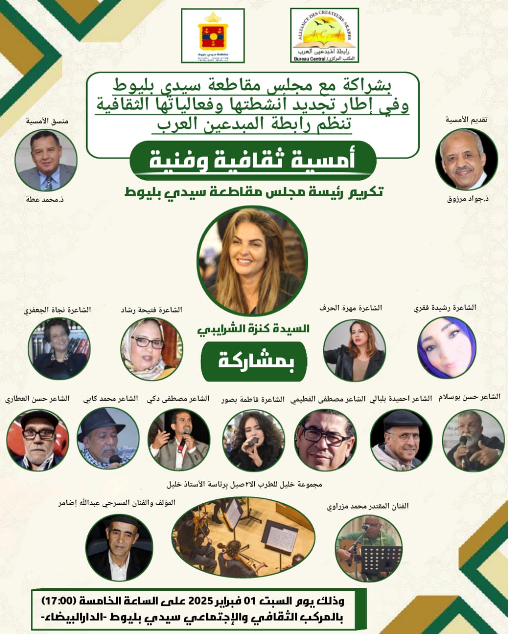 في إطار الأنشطة الثقافية والفنية والاجتماعية التي تقوم بها رابطة المبدعين العرب. ستنظم رابطة المبدعين العرب بالدار البيضاء الكبرى وبشراكة مع مجلس مقاطعة سيدي بليوط أمسية ثقافية وفنية، وبالمناسبة سيتم تكريم السيدة كنزة الشرايبي رئيسة مقاطعة سيدي بليوط وذالك يوم السبت 1فبراير 2025 بالمركب الثقافي والاجتماعي سيدي بليوط على الساعة الخامسة. بحضور شخصيات فكرية وثقافية وفنية.