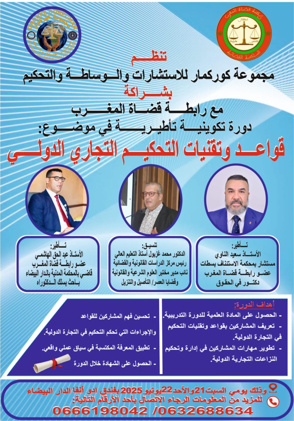 تنظم مجموعة كوركمار للاستشارات والوساطة والتحكيم، بشراكة مع رابطة قضاة المغرب، دورة تكوينية في التحكيم التجاري الدولي يومي 21 و22 يونيو 2025 بفندق إدو أنفا بالدار البيضاء.