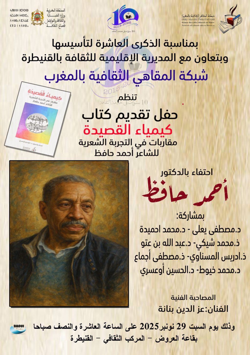بمناسبة الذكرى العاشرة لتأسيسها ، وتخليدا لخمسينية المسيرة الخضراء وسبعينية الإستقلال المجيد ، تنظم شبكة المقاهي الثقافية بالمغرب بتعاون مع المديرية الإقليمية للثقافة بالقنيطرة ، نشاطين ثقافيين يوم السبت 29 نونبر 2025 بالمركز الثقافي بمدينة القنيطرة حسب البرنامج التالي :